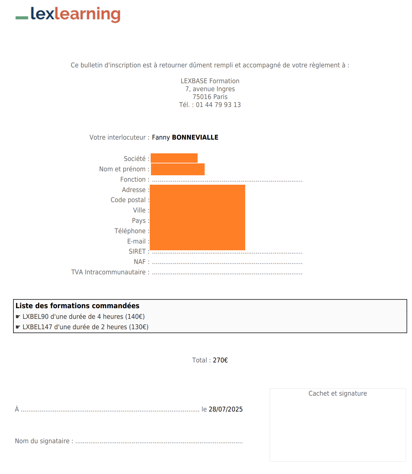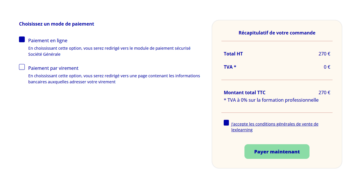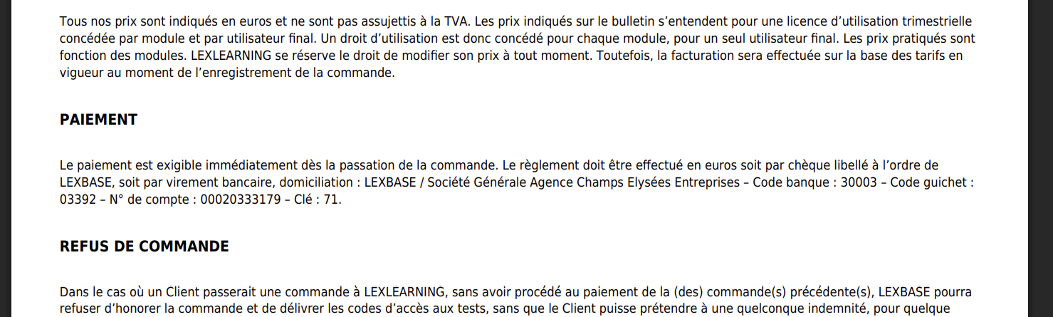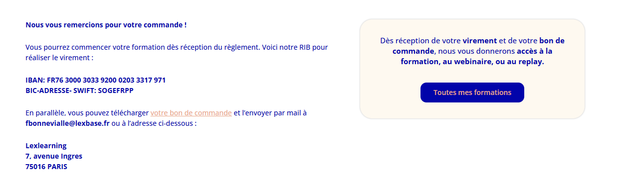 - Le bon de commande détaillé à nous joindre par mail (formations@lexlearning.fr) une fois que vous aurez procédé au virement. N'oubliez pas de le télécharger avant de quitter la page !