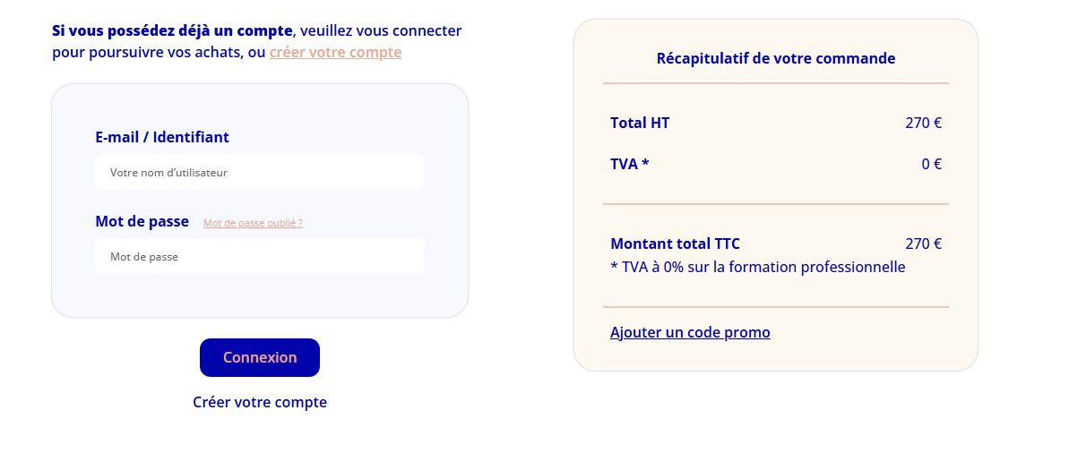 - Vous avez un code promo ? Indiquez le dans ajouter un code promo (sauf exception, nos codes promos ne fonctionnent pas sur les webinaires (à venir et replay) et les packs).